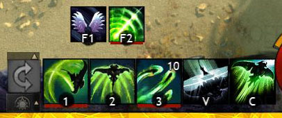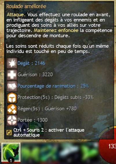 Attaque. Vous effectuez une roulade en avant, en infligeant des dégâts à vos ennemis et en prodiguant des soins à vos alliés sur votre trajectoire. Maintenez enfoncée la compétence pour descendre de monture.