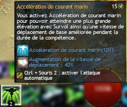 Vous activez Accélération de courant marin pour pouvoir atteindre une plus grande élévation avec Survol ainsi qu’une vitesse de déplacement de base améliorée pendant la durée de la compétence.