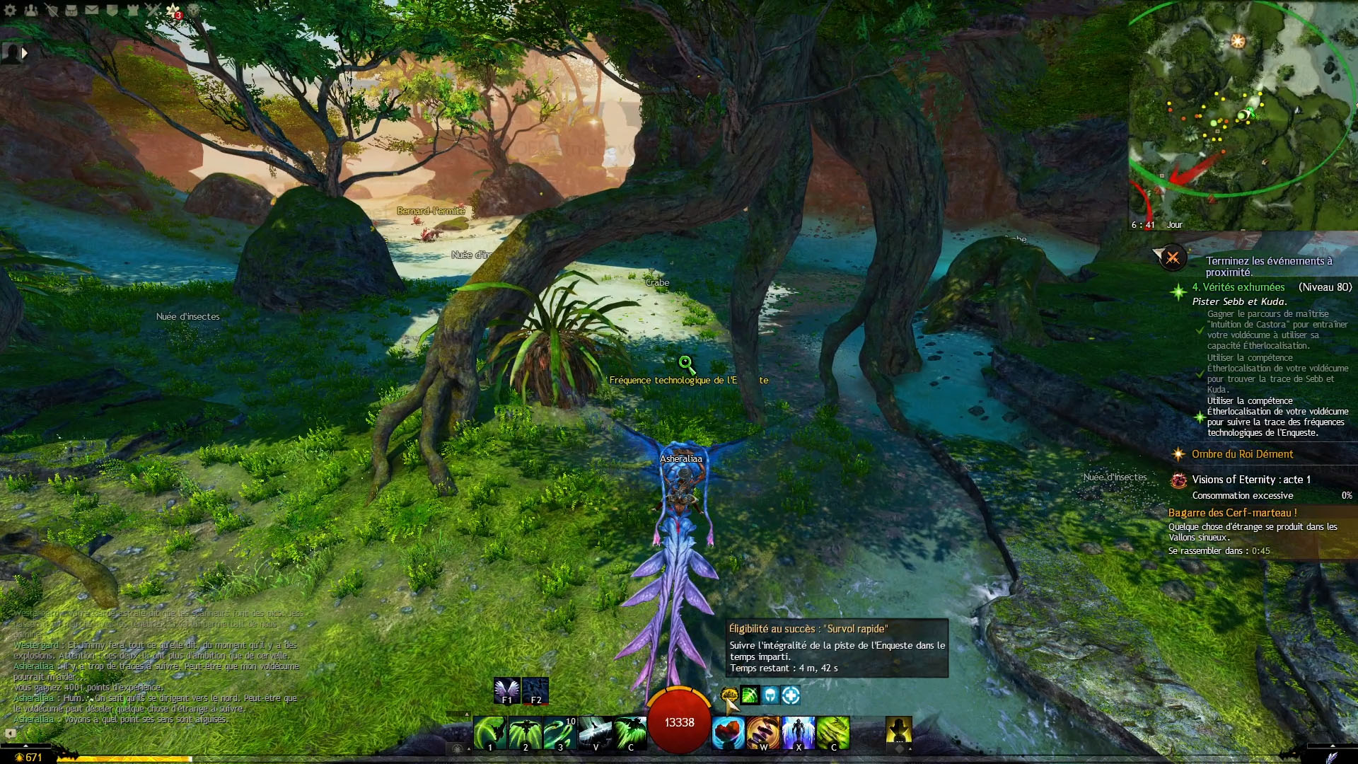 Trouver la fréquence finale avant que le moniteur de 5 minutes ne soit terminé. Pour cela, il faut utiliser l'Étherlocalisation du voldécume (F2) pour suivre la piste, et utiliser la Roulade améliorée (compétence 1) du voldécume sur les tas de sable localisés pour déterrer les Caches de l'Enqueste.